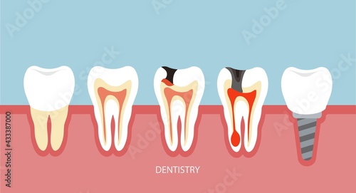 Набор значков здорового необработанного зуба и кариеса или кариозных полостей. Тяжесть разрушения зуба.