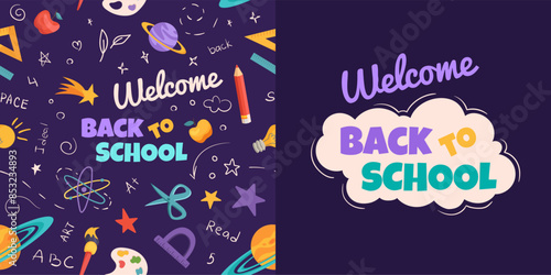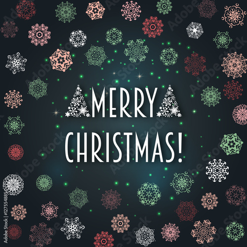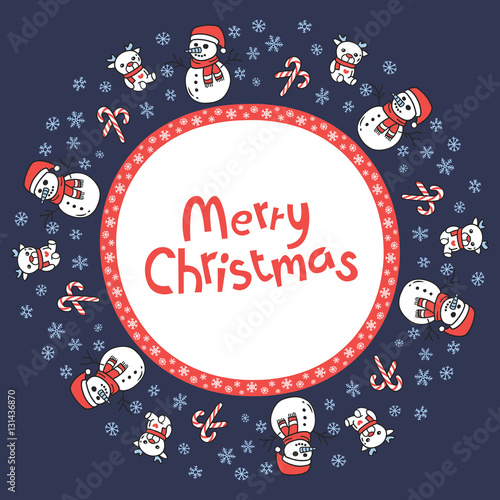Векторный праздничный бесшовный узор с оленями, подарками, снеговиками, ягодами падуба, шариками, снежинками, надписями. Декоративный элемент праздничного дизайна для рождественской поздравительной открытки, приглашения, оберточной бумаги.