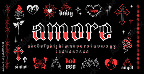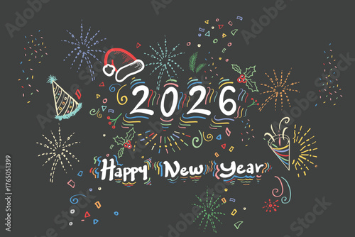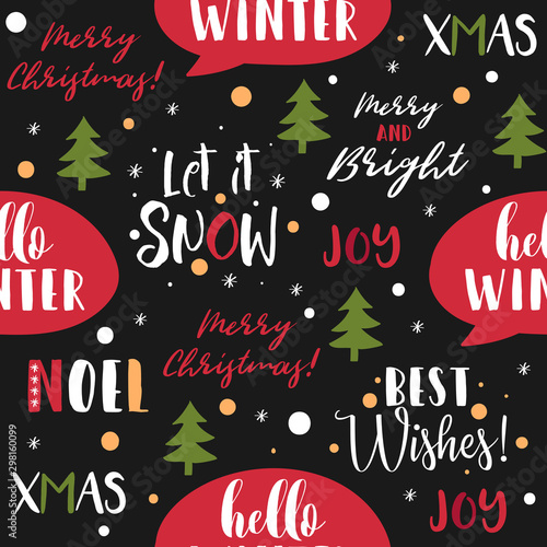 Векторный праздничный бесшовный узор с леденцами, подарками, елками, снежинками, надписями. Декоративный элемент праздничного дизайна для рождественской поздравительной открытки, приглашения, оберточной бумаги.