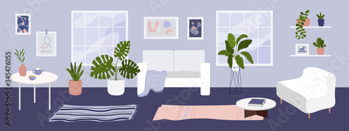Векторный дизайн квартиры в гостиной. Иллюстрация домашнего интерьера. Мебель в уютной комнате с картинами и часами на стене. Зона отдыха в доме. Комфортабельная квартира для проживания