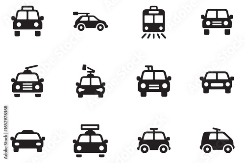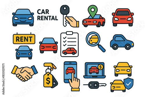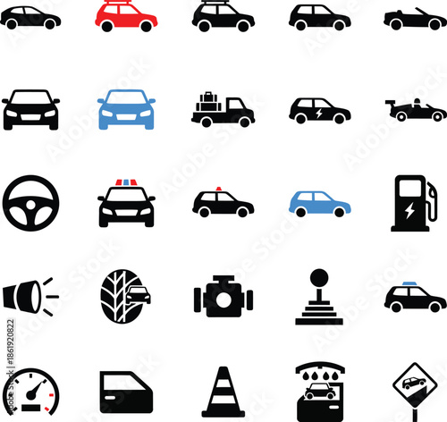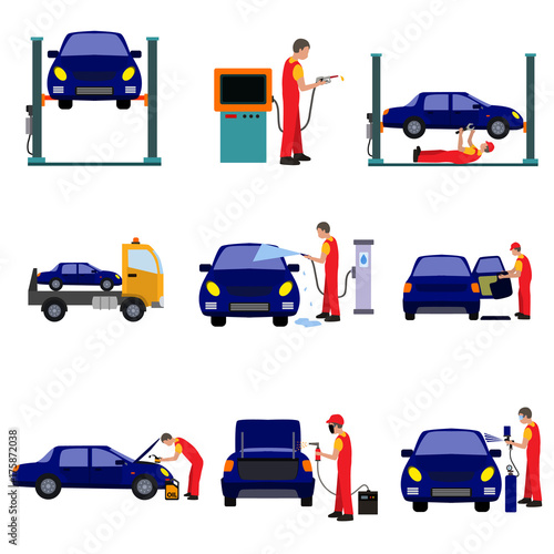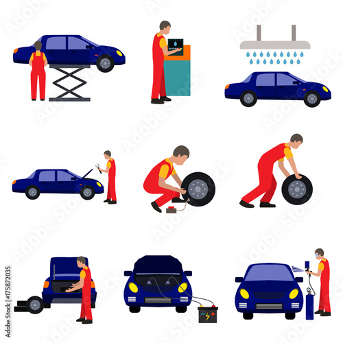 Набор векторных иконок автомобильного магазина, автосалона, элементов дизайна парковки с людьми-водителями, покупателями и продавцами мультяшных персонажей, изолированных на белом фоне. Элементы дизайна в плоском стиле.