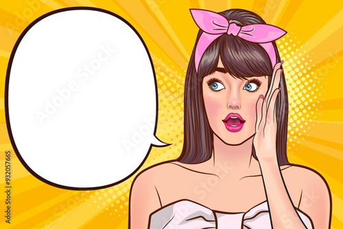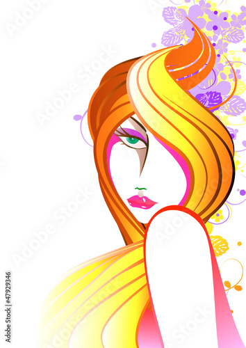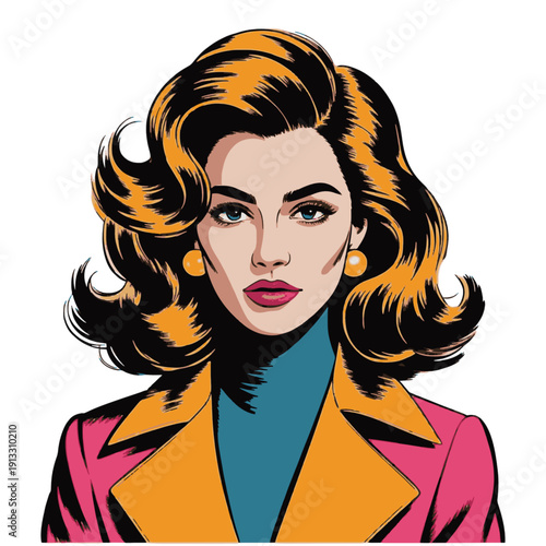 Векторная иллюстрация красивой блондинки с длинными и волнистыми волосами. Элемент дизайна в стиле ретро-поп-арт, шаблон для салона красоты.