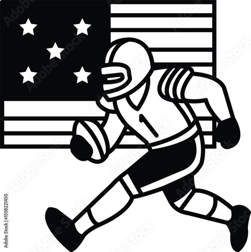 Векторная иллюстрация игрока в американский футбол, бегущего с мячом по полю. Элемент дизайна спортивной концепции. Футбольная форма, шлем и защита. Надпись по американскому футболу.