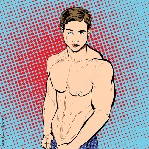 Векторная иллюстрация спортивного сильного мужчины с гантелями в стиле ретро-поп-арт. Тренирующийся мужчина.