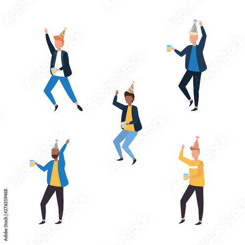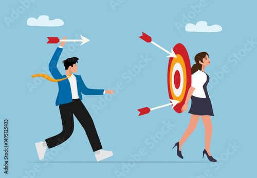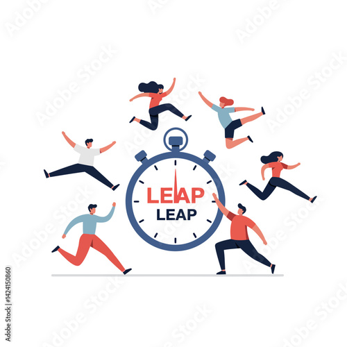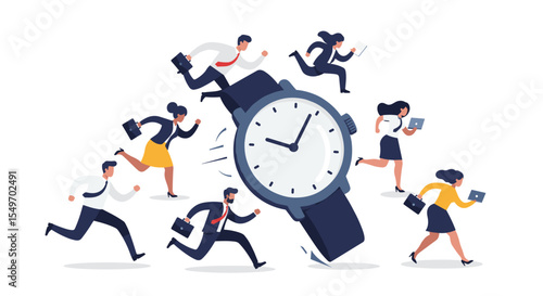 Векторная иллюстрация деловых людей, бегущих, догоняющих время. Они спешат на работу. Указательный палец указывает на время на часах. Элемент дизайна в плоском стиле.