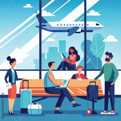 Векторная иллюстрация деловых людей в аэропорту. Бизнесмены с планшетом, ноутбуком сидят в зале ожидания. Деловая поездка, путешествие на самолете концептуальный элемент дизайна в плоском стиле.