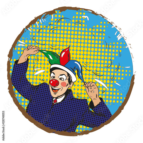 Векторная иллюстрация бизнесмена-клоуна в шутовской шляпе в стиле комиксов ретро-поп-арта. Сумасшедший человек, заставляющий людей смеяться, в круглой рамке.