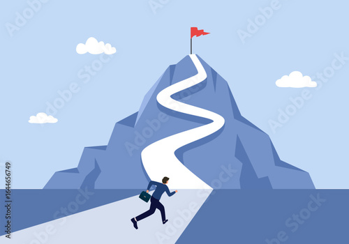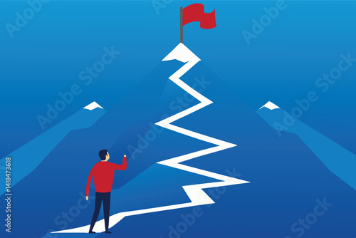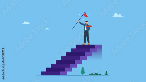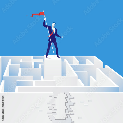 Векторная иллюстрация бизнесмена, преодолевающего трудности и находящего выход из лабиринта. Человек, держащий высоко поднятый флаг. Бизнес-стратегия, концепция успеха дизайн в плоском стиле.