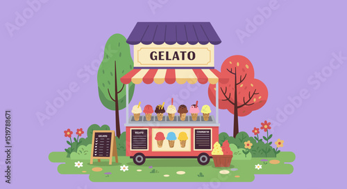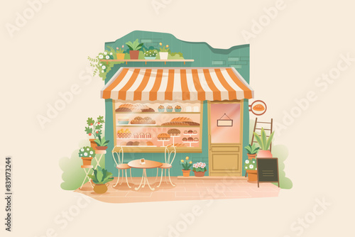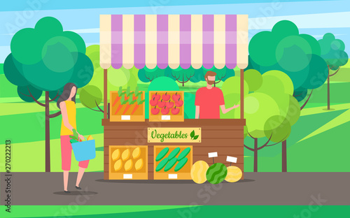 Векторная иллюстрация мясника в плоском стиле. Женщина-покупатель собирается сделать покупки. Мясо, бекон, сосиски, салями. Ларек на рынке с мясными продуктами.