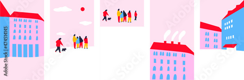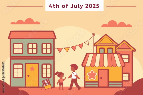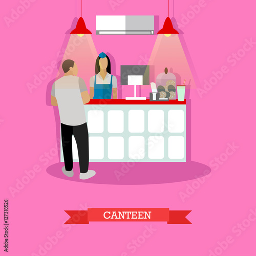 Векторная иллюстрация интерьера столовой в плоском стиле. Элемент дизайна столовой с женщиной, обслуживающей посетителя-мужчину.