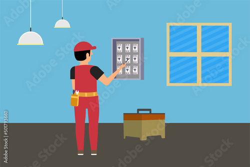 Векторная иллюстрация шеф-повара, готовящего блюда с помощью сковороды. Интерьер кухни ресторана, кухонная утварь и бытовая техника, элементы дизайна в плоском стиле.