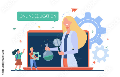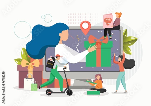 Векторная иллюстрация детей мальчика и девочки с санками. Зимняя снежная погода, снегопад, концептуальный элемент дизайна катания на санках в плоском стиле.
