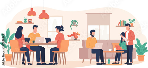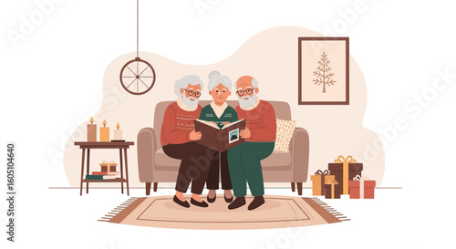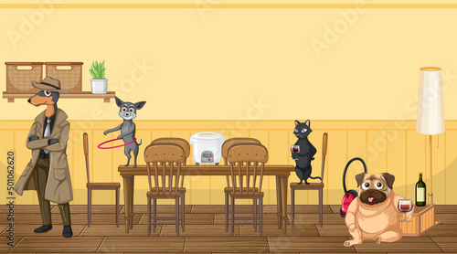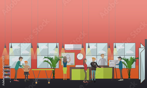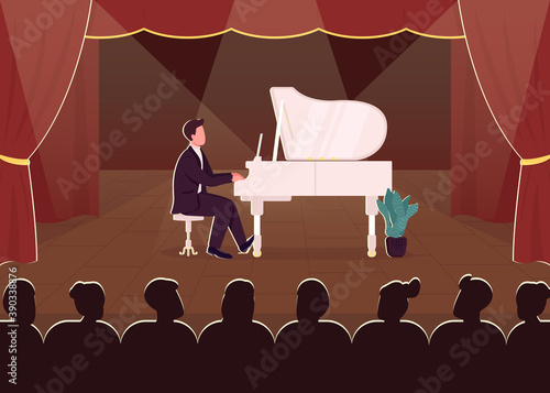Векторная иллюстрация хора с дирижером, выступающего на сцене концертного зала под аккомпанемент фортепиано и саксофона. Дизайн в плоском стиле.