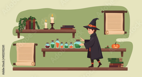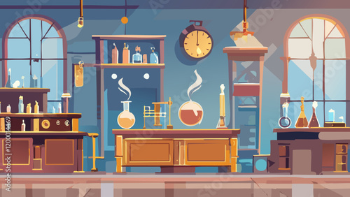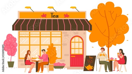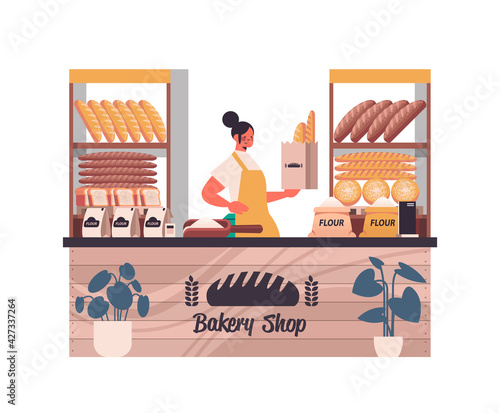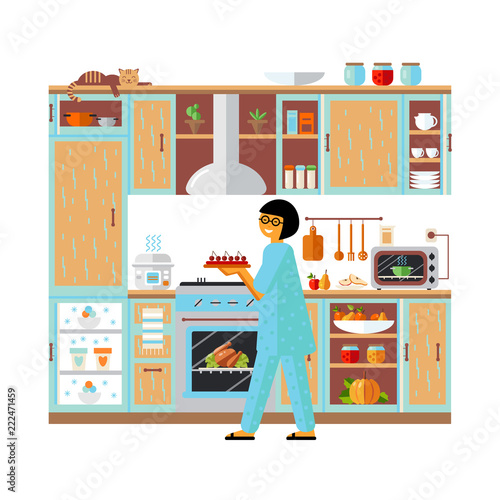 Векторная иллюстрация элемента дизайна кофейни с бариста, стоящим за барной стойкой, оборудованием для приготовления кофе, посудой, меню. Интерьер кофейни и мультяшный персонаж в плоском дизайне.