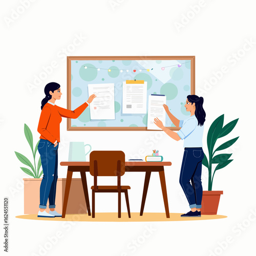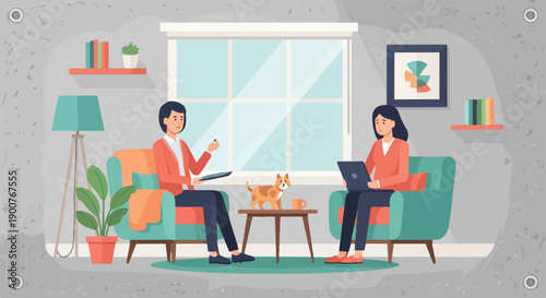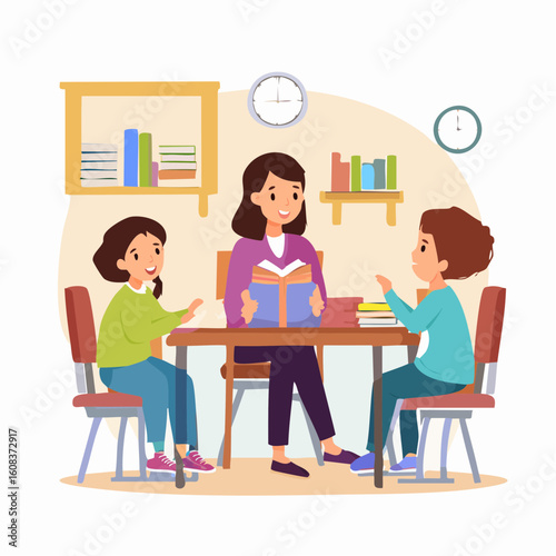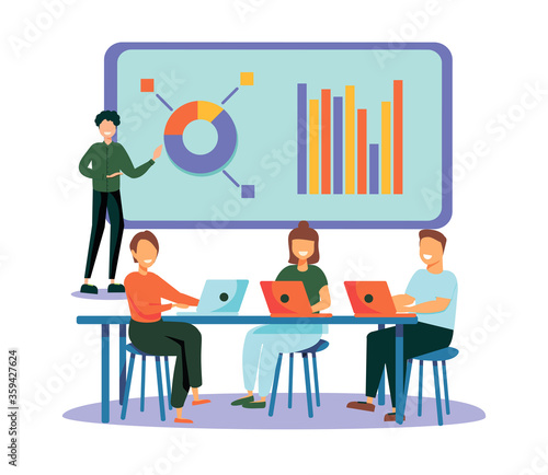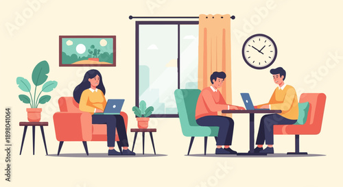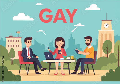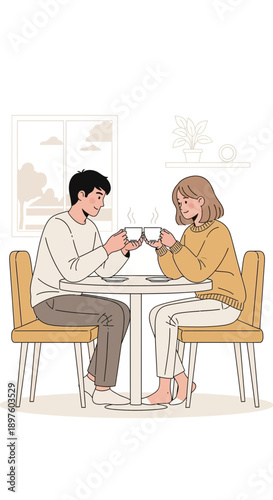 Векторная иллюстрация элемента дизайна кофейни с посетителями, молодой парой, сидящей за столом и завтракающей или кофе-брейком. Интерьер кофейни и мультяшный персонаж в плоском дизайне.