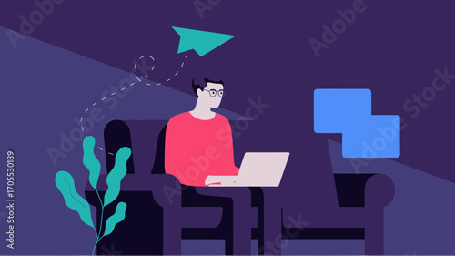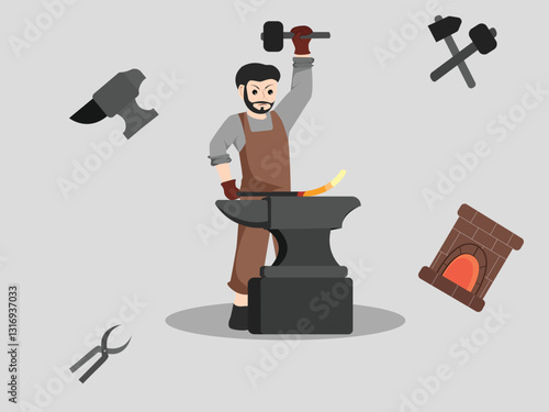 Векторная иллюстрация повара, держащего кухонный нож и вилку, готового подавать блюдо с огнем. Интерьер ресторана. Дизайн в плоском стиле.