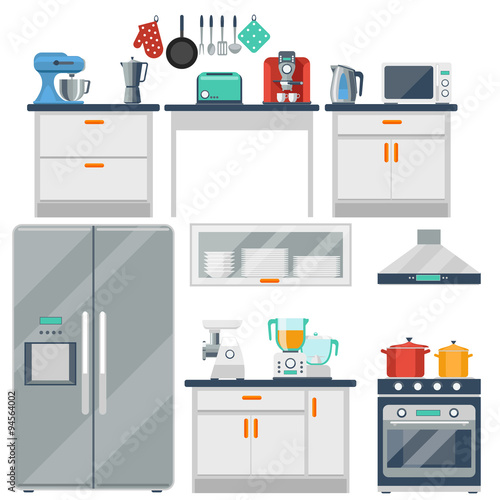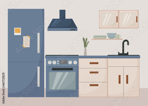 Векторная иллюстрация посудомоечной машины. Интерьер кухни с мебелью и бытовой техникой в плоском стиле. Микроволновая печь, бутылка вина и ваза с фруктами