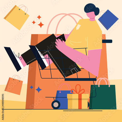 Векторная иллюстрация женского магазина в плоском стиле. Женщины ходят по магазинам, манекен в повседневной летней одежде, платья на вешалках. Магазин модной одежды, интерьер бутика.