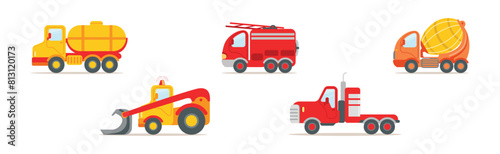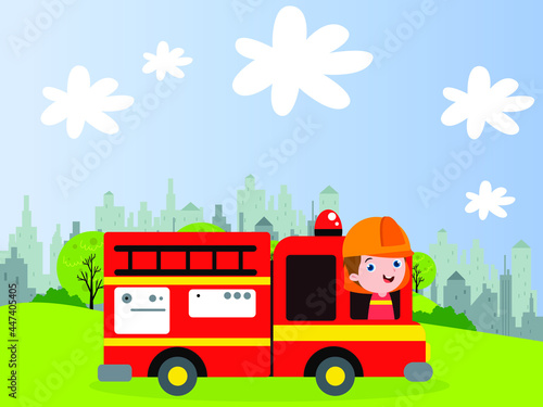 Векторная иллюстрация пожарной машины. Пожарная машина и пожарный в костюме противопожарной защиты и элементе дизайна шлема в плоском стиле.