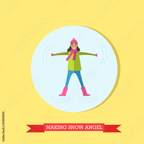 Векторная иллюстрация девушки, делающей снежного ангела. Элемент дизайна концепции зимних мероприятий для людей в плоском стиле.