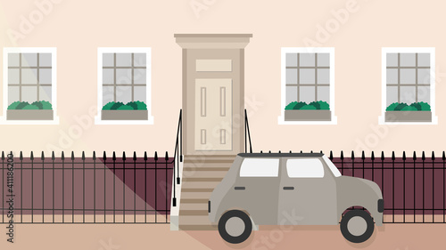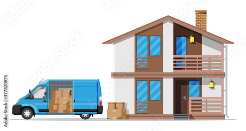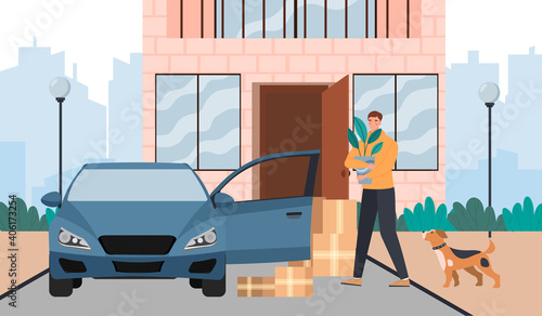 Векторная иллюстрация домашнего робота, подстригающего газон, и человека, сидящего в кресле возле дома со стаканом лимонада, отдыхающего. Мультяшные персонажи в плоском дизайне.
