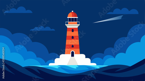 Векторная иллюстрация маяка на прибрежной скале или островной скале, океанской волны и чаек. Элементы дизайна в плоском стиле.