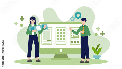 Векторная иллюстрация концепции уличной еды в плоском стиле. Молодые мужчина и женщина стоят возле продуктового киоска в парке.
