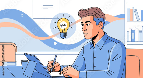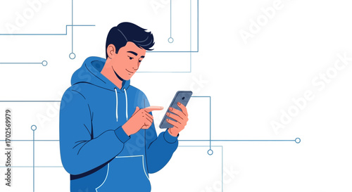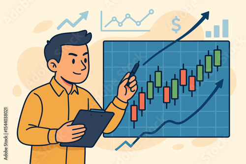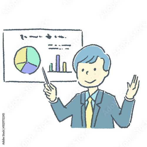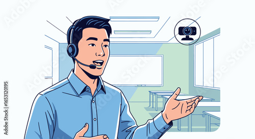 Векторная иллюстрация молодого человека с микрофоном, делающего презентацию и показывающего большой палец вверх рукой в стиле ретро-поп-арт-комиксов. Бизнес-семинар, презентация, тренинг, концепция конференции.