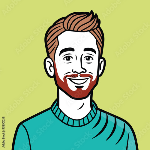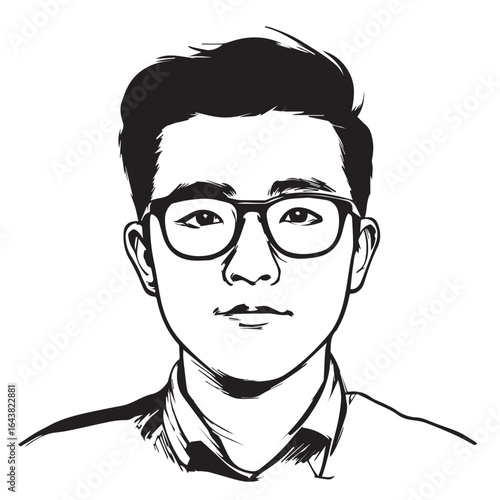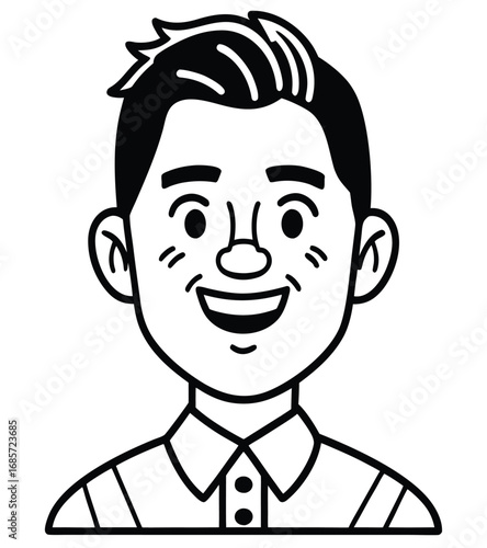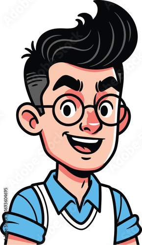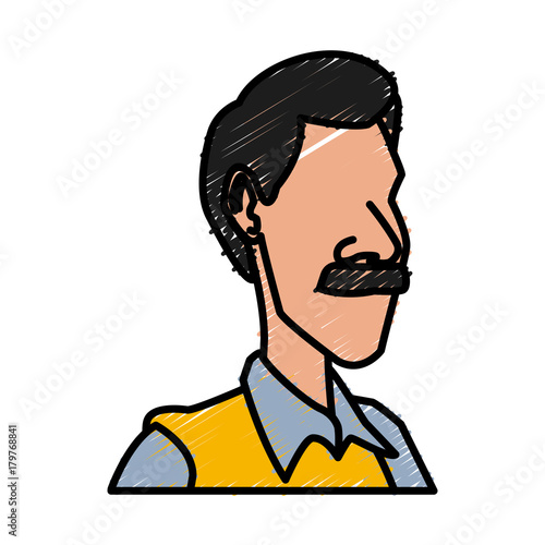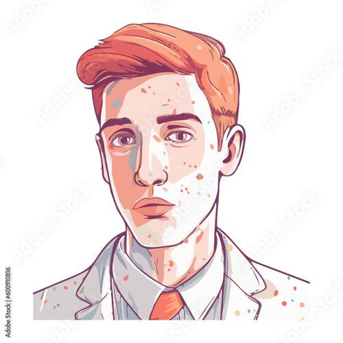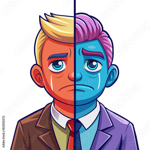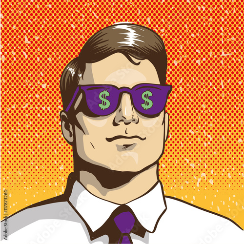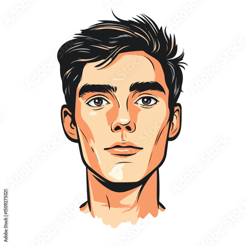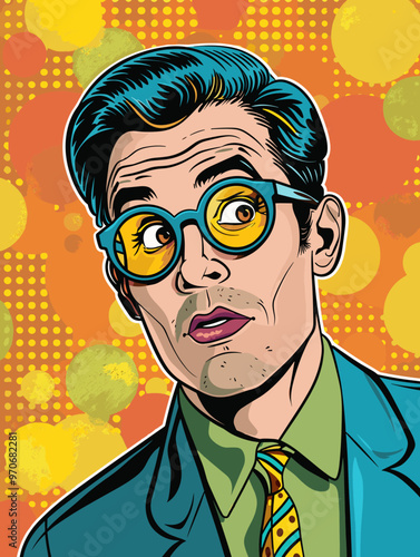 Векторная иллюстрация человека с зубчатыми колесами на правой части лица в стиле комиксов ретро-поп-арта. Спокойное, бесстрастное лицо.