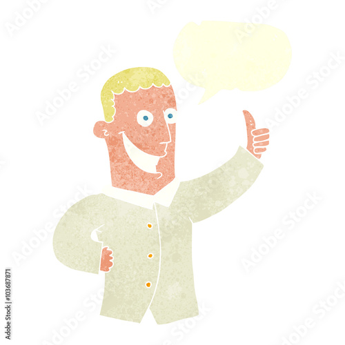 Векторная иллюстрация мужчины, бизнесмена с поднятым большим пальцем руки в стиле ретро-поп-арт-комиксов. Жест одобрения. Речевой пузырь.