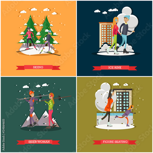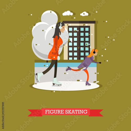 Векторная иллюстрация матери с дочерью, катающейся на коньках. Мультяшные персонажи. Элемент дизайна концепции зимних видов спорта и отдыха в плоском стиле.