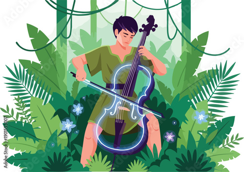 Векторная иллюстрация женщины-музыканта, играющей на струнном музыкальном инструменте контрабас. Элемент дизайна в плоском стиле.