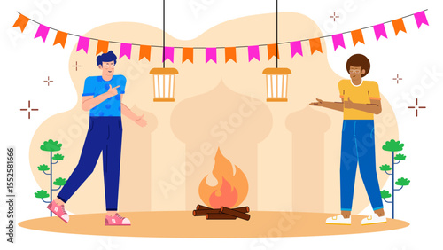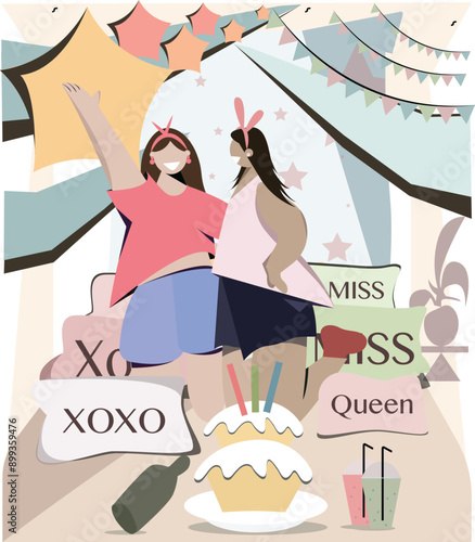 Векторная иллюстрация женщин с бенгальскими огнями. Праздничный ужин, бутылка шампанского на столе. Интерьер гостиной. Элемент дизайна празднования Нового года в плоском стиле.