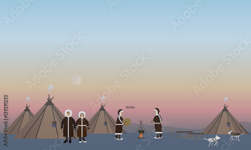 Векторная иллюстрация северных арктических людей и их домов в плоском стиле. Эскимосские персонажи готовят еду на открытом огне, играют на барабанах и танцуют.