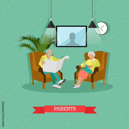 Векторная иллюстрация родителей, сидящих в креслах. Мужчина читает газету, женщина вяжет. Интерьер гостиной. Элемент дизайна семейной концепции в плоском стиле.