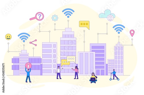 Векторная иллюстрация людей, катающихся на коньках на катке. Мультяшные персонажи, городской пейзаж. Элемент концептуального дизайна зимних видов спорта и активного отдыха в плоском стиле.