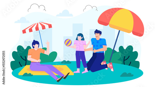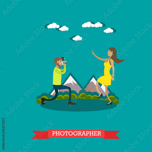 Векторная иллюстрация фотографа, фотографирующего молодую женщину. Оператор камеры, персонаж-корреспондент в плоском дизайне.