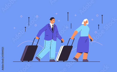 Векторная иллюстрация пилота и стюардессы с багажом. Персонал авиакомпании, элемент дизайна в плоском стиле бортпроводников, значок, выделенный на белом фоне.