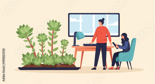 Векторная иллюстрация детектива, работающего в офисе со своей клиенткой молодой леди. Детективное агентство интерьера. Элемент дизайна квартиры частного детектива.