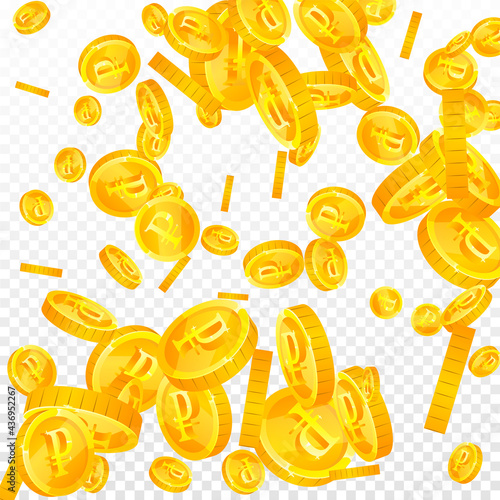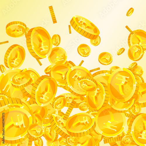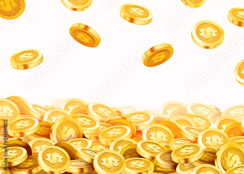 Векторная иллюстрация реалистичных 3d золотых монет со знаком доллара. Падающие золотые монеты, изолированные на белом фоне.