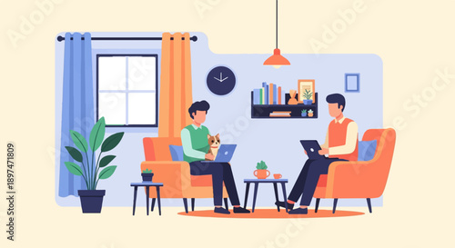Векторная иллюстрация робота-официанта, подающего посетителю колу и гамбургер. Пузырь речи вашего заказа. Молодой человек с мобильным телефоном сидит за столом. Интерьер кафе и персонажи мультфильмов в плоском дизайне.