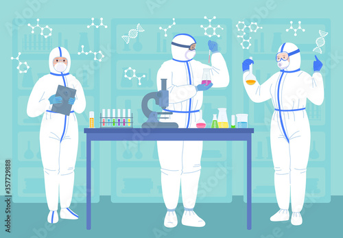 Векторная иллюстрация ученых, двух мужчин и женщины, работающих в научной лаборатории. Интерьер лаборатории, оборудование и лабораторная посуда. Концепция научного исследования элемент дизайна в плоском стиле.