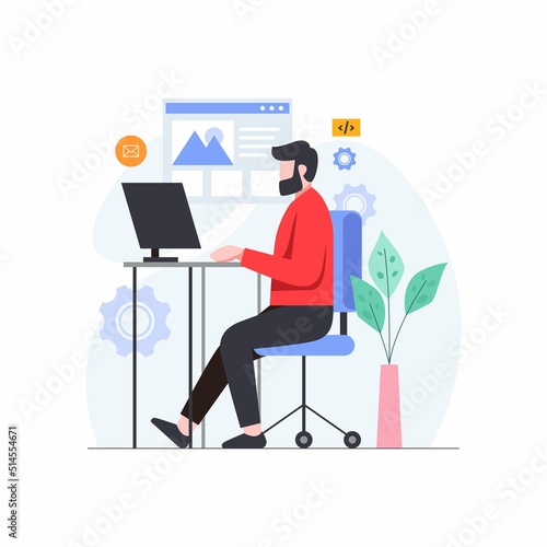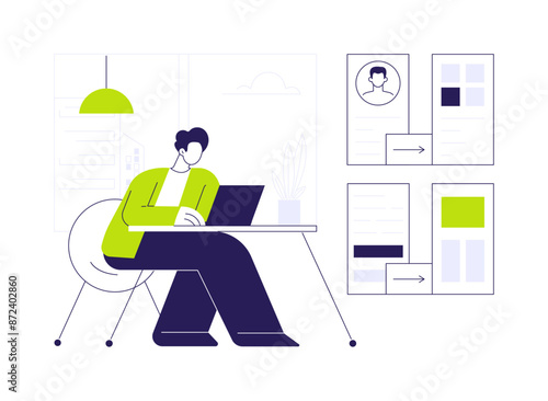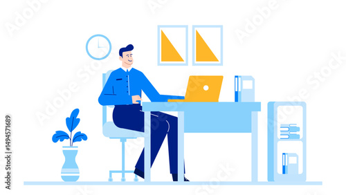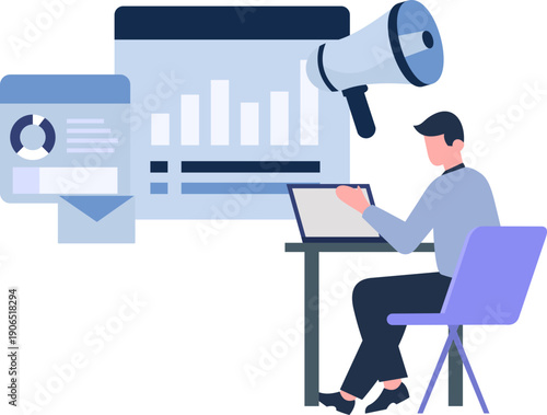Векторная иллюстрация спящего бизнесмена на работе. Офисный работник сидит над бумагами перед ноутбуком. Человеческая рука, держащая мегафон. Дизайн в плоском стиле.