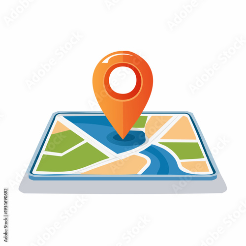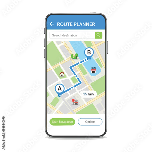 Векторная иллюстрация смартфона с мобильным навигационным приложением на экране. Карта маршрута с символами, показывающими местоположение человека. Элемент дизайна концепции глобальной системы позиционирования в плоском стиле.