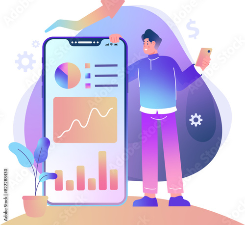 Векторная иллюстрация концепции шведского стола в плоском стиле. Посетители, мужчина и женщина, стоят возле стола с гамбургерами, выпечкой и десертами. Интерьер ресторана.