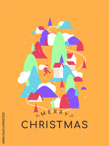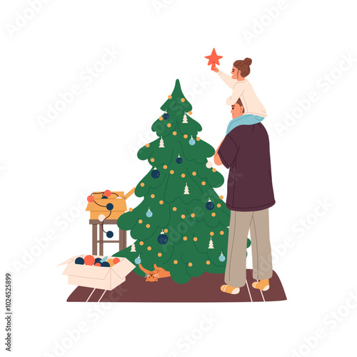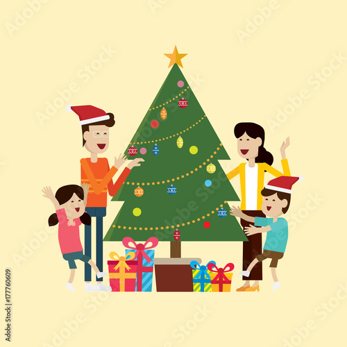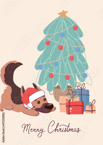 Векторная иллюстрация Снегурочки, стоящей возле украшенной новогодней елки с подарками. Мультяшный персонаж. Элемент дизайна Happy New Year в плоском стиле.