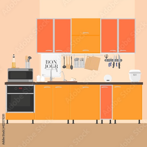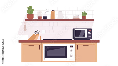 Векторная иллюстрация печи. Интерьер кухни с мебелью и посудой в плоском стиле. Кастрюля, чашки с кофе, кофеварка, кофемолка и молоко.