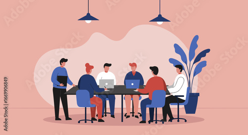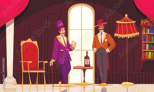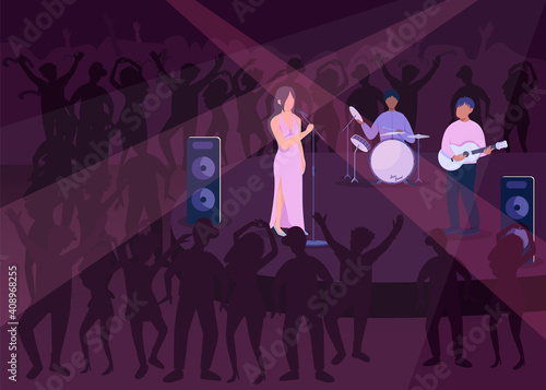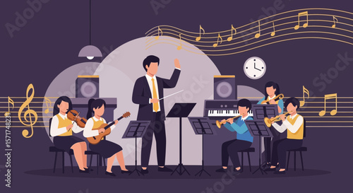 Векторная иллюстрация симфонического оркестра, играющего музыку на сцене концертного зала. Элементы дизайна дирижера, скрипача, басиста, трубача, флейтиста и публики в плоском стиле.
