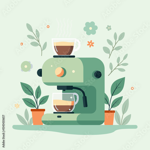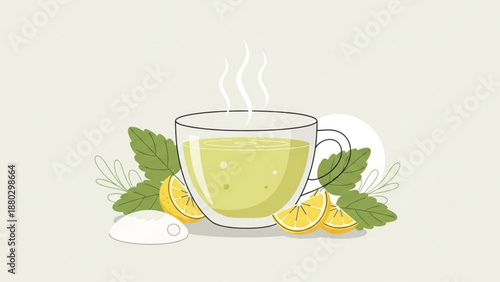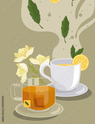 Векторная иллюстрация современного стеклянного чайника со свежезаваренным чаем, чашкой горячего ароматного чая и свежим, спелым лимоном с ломтиками. Популярный напиток на утро. Плоская конструкция