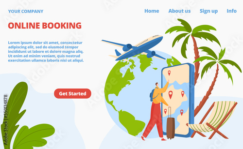 Векторная иллюстрация путешественников мужчины и женщины с багажом. Элемент концептуального дизайна путешествия на самолете в плоском стиле.
